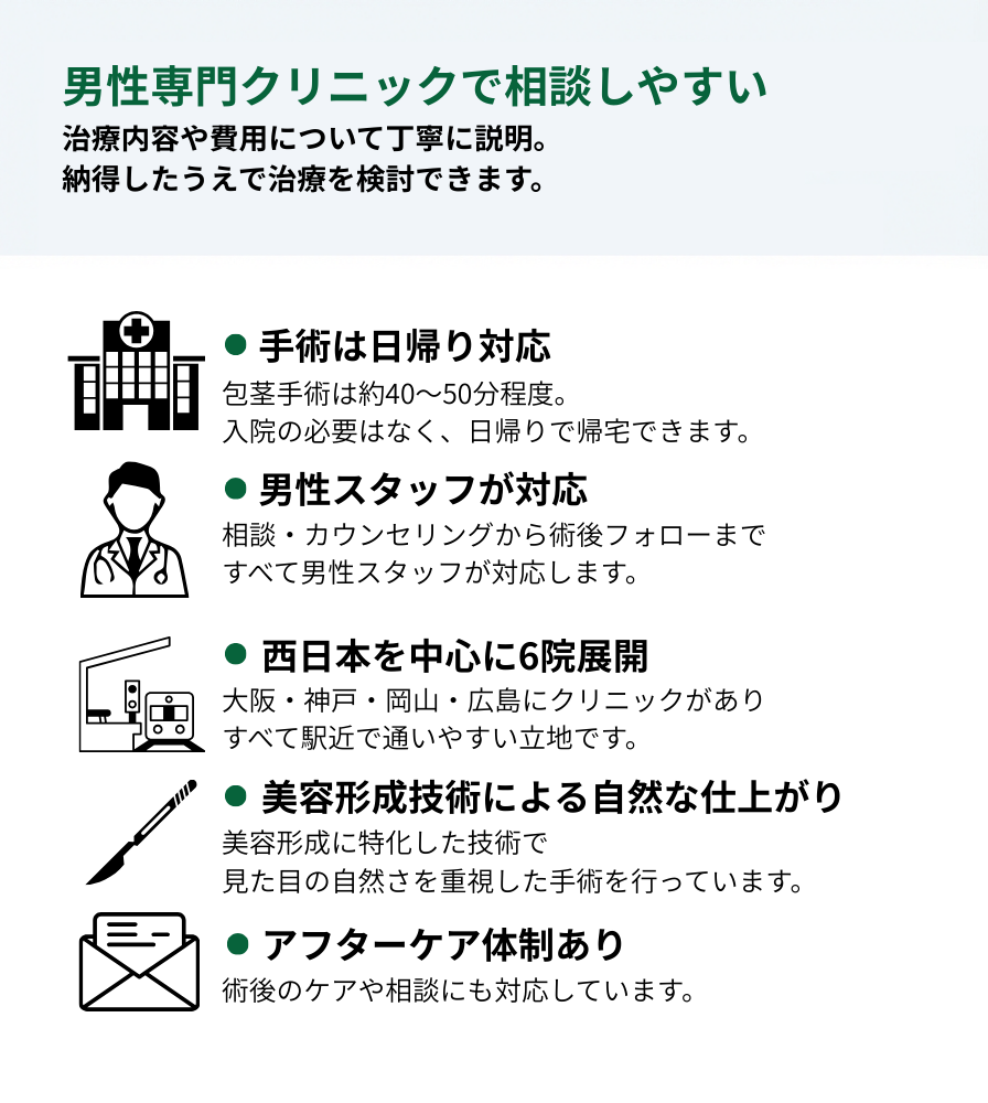 西日本エリアで包茎手術や長茎術を検討している人にとって、相談しやすい選択肢のひとつと言えるでしょう。