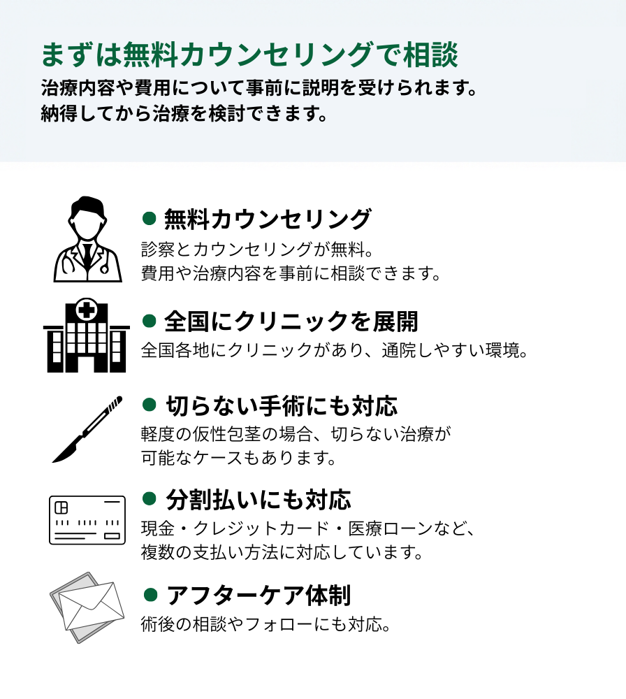 状態によっては切開手術が必要になる場合もあるため、詳細はカウンセリングで判断されます。