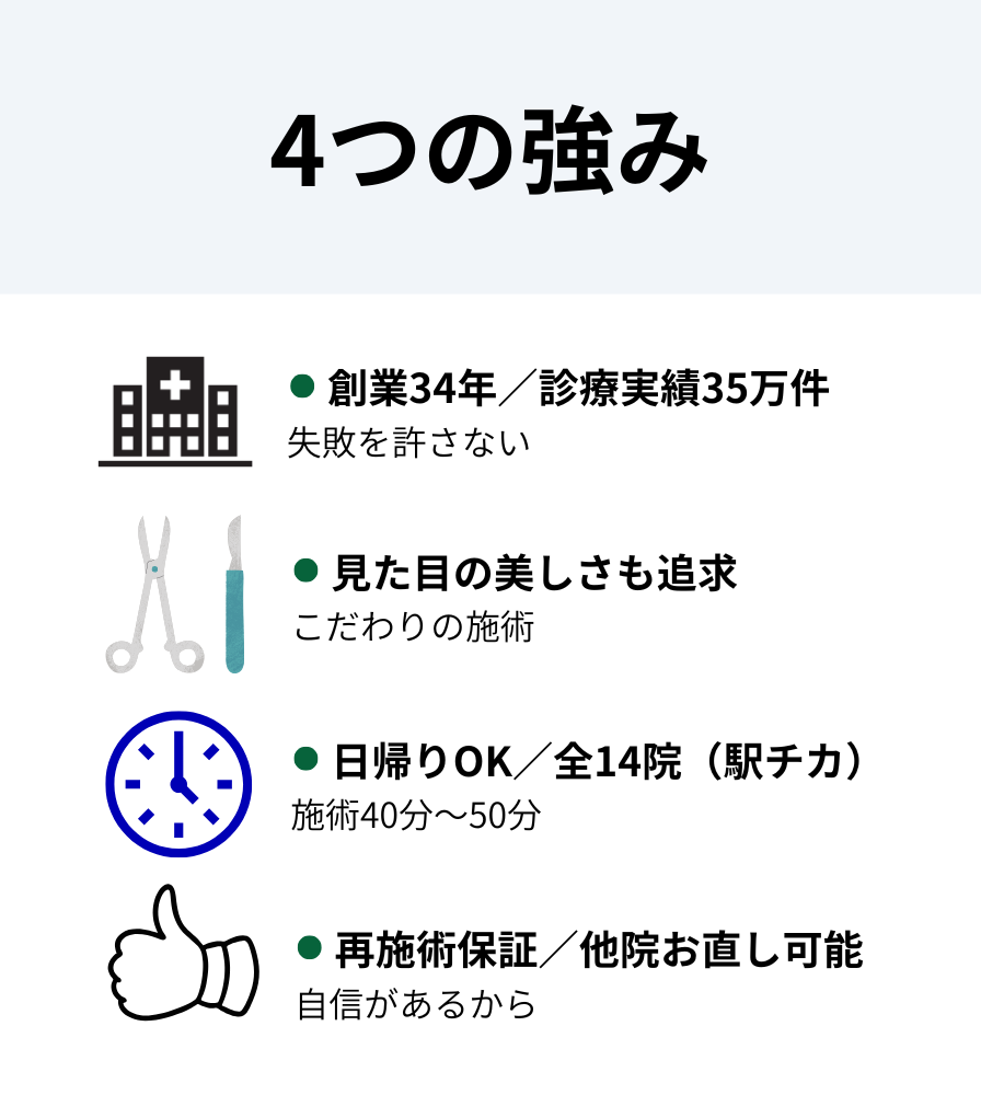 公式サイトの情報をもとに、現在のクリニックの強みを整理すると以下のようになります。