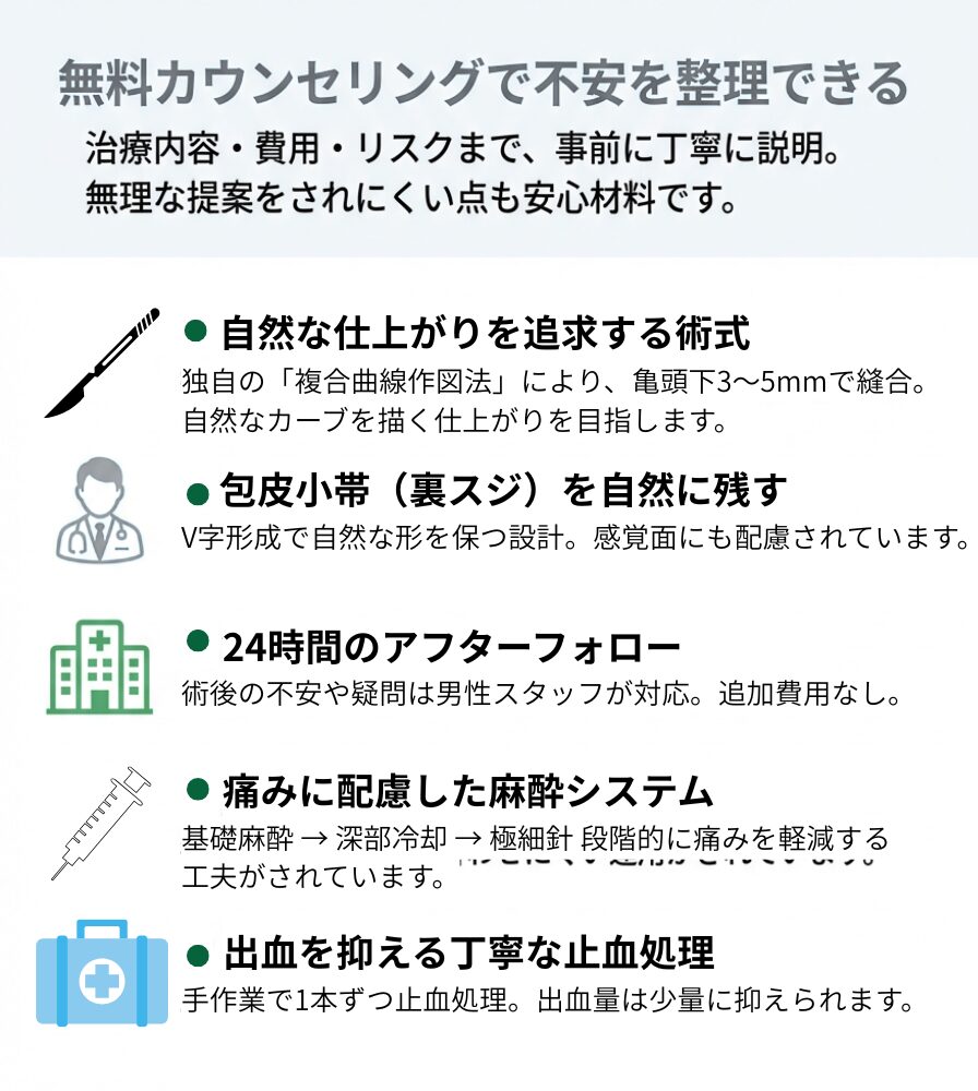 筆者もカウンセリングを受けましたが、時間をかけて丁寧に説明や診察を行ってくれて、包茎手術に対する不安を解消することができました。